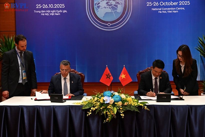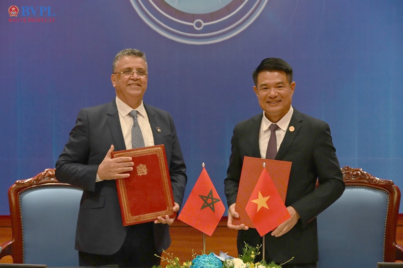 | Đồng chí Viện trưởng Nguyễn Huy Tiến và ông Abdellatif Ouahbi, Bộ trưởng Bộ Tư pháp Vương quốc Ma-rốc ký Hiệp định tương trợ tư pháp về hình sự giữa Việt Nam và Ma - rốc. |