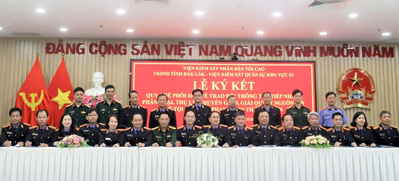 VKSND tỉnh Đắk Lắk vừa chủ trì, tổ chức Lễ ký kết Quy chế phối hợp về trao đổi thông tin, tiếp nhận, phân loại, thụ lý, chuyển giao, giải quyết nguồn tin về tội phạm, vi phạm theo thẩm quyền giữa VKSND các khu vực và VKSQS khu vực 53, Quân khu 5.