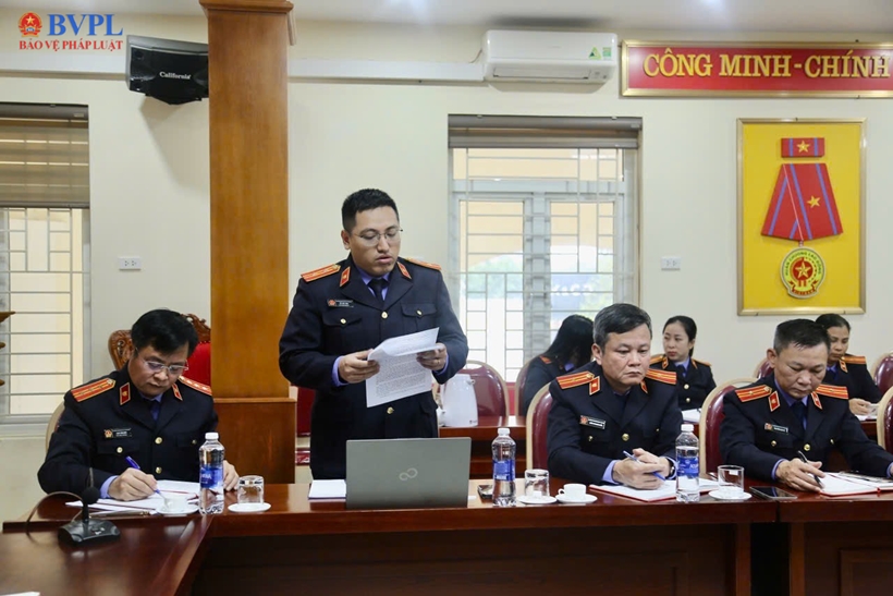 | Kiểm sát viên Kim Duy Chung, Trưởng bộ phận thi hành án hình sự thảo luận tại hội nghị. |