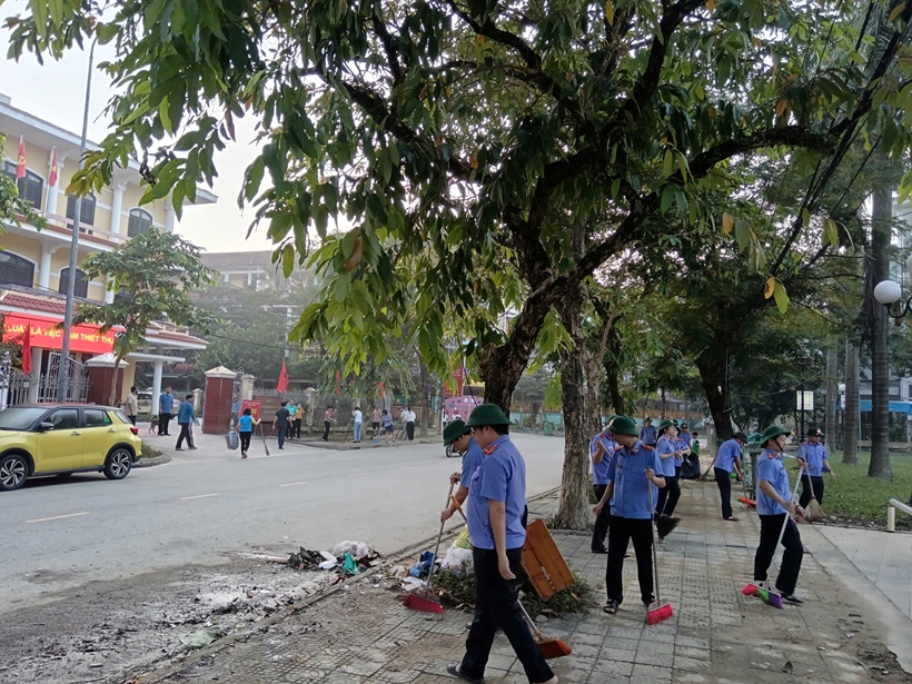 | Ra quân dọn dẹp vệ sinh nhằm hưởng ứng “Ngày chủ nhật xanh”. |
