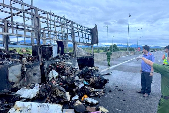 Khi đến Km13+200, đoạn qua thôn Phong Thử 2, xã Điện Bàn Tây, TP Đà Nẵng, anh Diệp phát hiện thùng hàng phía sau xe bốc cháy nên tấp xe vào lề phải và phối hợp người dân thông báo lực lượng phòng cháy chữa cháy khu vực Hòa Vang đến hỗ trợ.