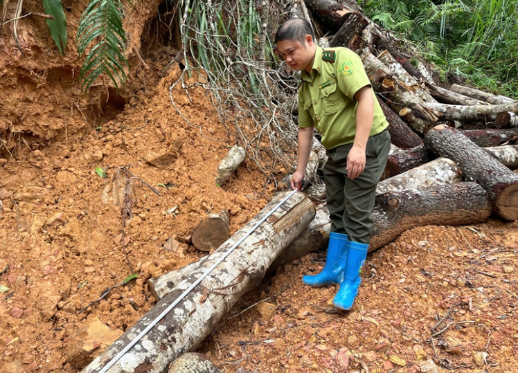 | Kiểm lâm viên tiến hành đo đạc, kiểm đếm số lượng cây gỗ rừng bị chặt phá. |