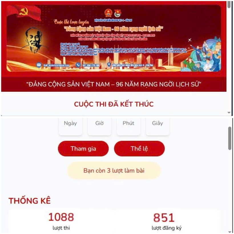 Cuộc thi trực tuyến “Đảng Cộng sản Việt Nam – 96 năm rạng ngời lịch sử” được tổ chức từ ngày 28/01/2026 đến ngày 4/2/2026, thu hút hơn 1.000 lượt tham gia của đông đảo cán bộ, công chức, người lao động, đoàn viên, thanh niên, học sinh và sinh viên trên địa bàn khu vực 4 – Cần Thơ.