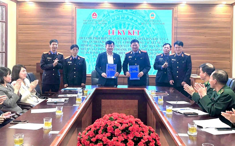Nhằm tăng cường hiệu quả phối hợp liên ngành trong thực hiện chức năng, nhiệm vụ theo quy định của pháp luật, ngày 30/12/2025, tại trụ sở VKSND khu vực 4 - Quảng Ninh đã long trọng diễn ra Lễ ký kết quy chế phối hợp liên ngành giữa VKSND khu vực 4 với các cơ quan chức năng trên địa bàn, gồm: Toà án nhân dân khu vực 4 (TAND); Hải quan Cửa khẩu Hoành Mô; Đồn Biên phòng Cửa khẩu Hoành Mô, Cửa khẩu cảng Cẩm Phả, Quảng Đức; Hạt Kiểm lâm các khu vực 4, 5, 6; Đội quản lý thị trường số 2, số 8; Bảo hiểm xã hội các cơ sở Tiên Yên, Bình Liêu, Quảng Hà và Thuế các cơ sở 6, 7 tỉnh Quảng Ninh (gọi tắt là các cơ quan tham gia quy chế).