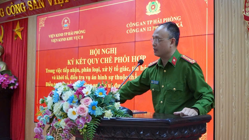 | Đồng chí Trần Đức Minh – Phó Thủ trưởng Cơ quan Cảnh sát điều tra Công an TP Hải Phòng phát biểu tại hội nghị. |