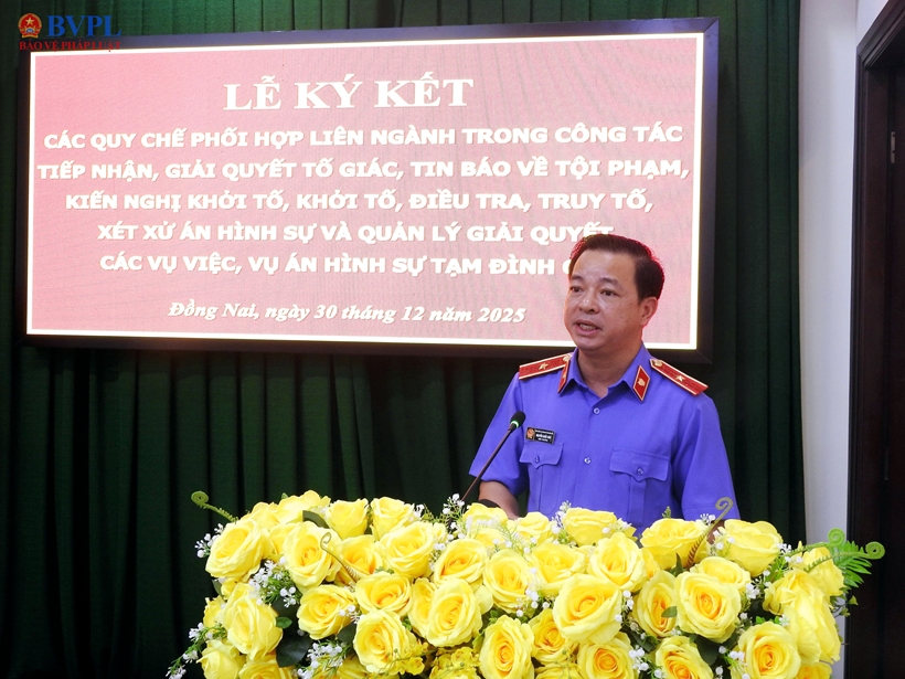 Ngày 30/12/2025, VKSND tỉnh Đồng Nai chủ trì, phối hợp với Công an tỉnh, Tòa án nhân dân tỉnh và các cơ quan liên quan tổ chức Lễ ký kết 3 Quy chế phối hợp liên ngành trong công tác hình sự, nhằm nâng cao hiệu quả đấu tranh phòng, chống tội phạm và bảo đảm việc xử lý các vụ án hình sự đúng quy định của pháp luật.