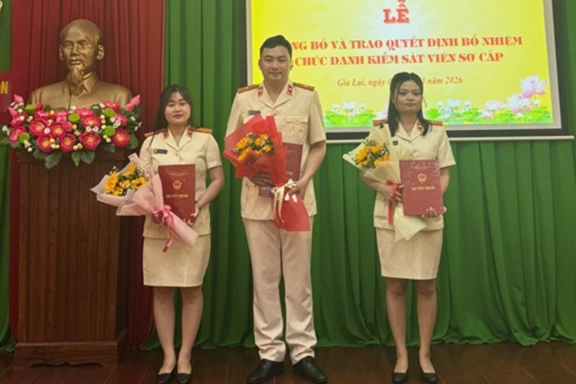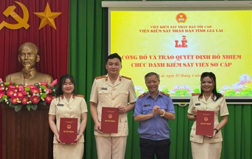 Tại buổi lễ, đồng chí Trịnh Viết Diệp, Trưởng phòng Tổ chức cán bộ VKSND tỉnh Gia Lai đã công bố các quyết định của Viện trưởng VKSND tối cao về việc bổ nhiệm chức danh Kiểm sát viên sơ cấp đối với 3 đồng chí, thời hạn là 5 năm, kể từ ngày 1/4/2026.