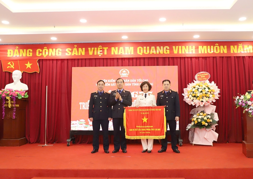 | Đồng chí Phan Huy Ngọc, Phó Bí thư Tỉnh ủy, Giám đốc Công an tỉnh Hà Giang trao Cờ thi đua Đơn vị xuất sắc phong trào thi đua của VKSND tối cao tặng các đơn vị thuộc VKSND tỉnh Hà Giang. |