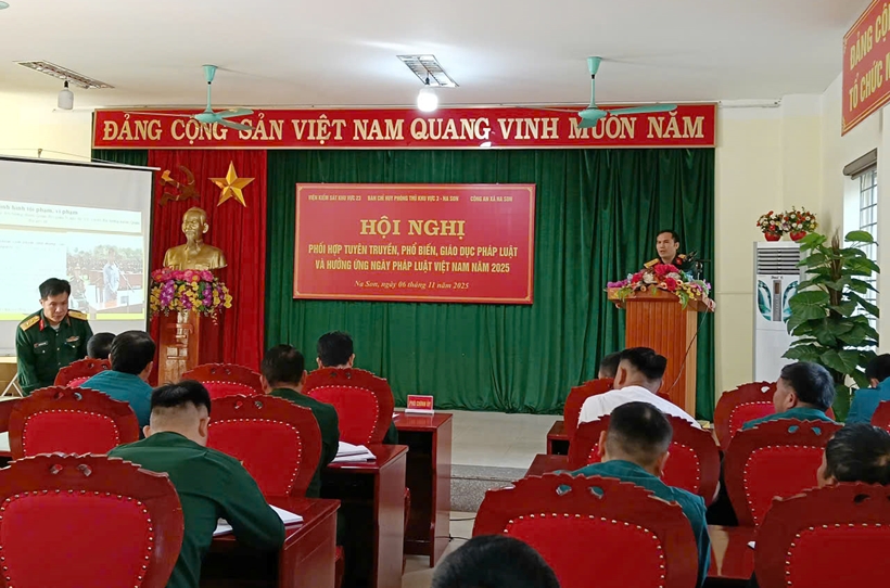 Hưởng ứng Ngày Pháp luật nước Cộng hòa xã hội chủ nghĩa Việt Nam (9/11/46-9/11/2025), ngày 6/11/2025, VKSQS khu vực 23 phối hợp với Ban Phòng thủ khu vực 3 Na Son- Bộ CHQS tỉnh Điện Biên tổ chức buổi tuyên truyền, phổ biến giáo dục pháp luật cho đối tượng là Đảng ủy, chỉ huy Ban Phòng thủ khu vực 3 Na Son, lãnh đạo của các đơn vị VKSQS khu vực 23, Công an xã Na Son và toàn thể cán bộ, nhân viên trong đơn vị.
