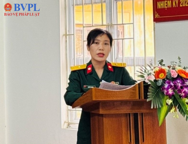 | Đồng chí Thiếu tá Nguyễn Thị Huân, Phó Viện trưởng VKSQS khu vực 32 phát biểu tại Hội nghị. |