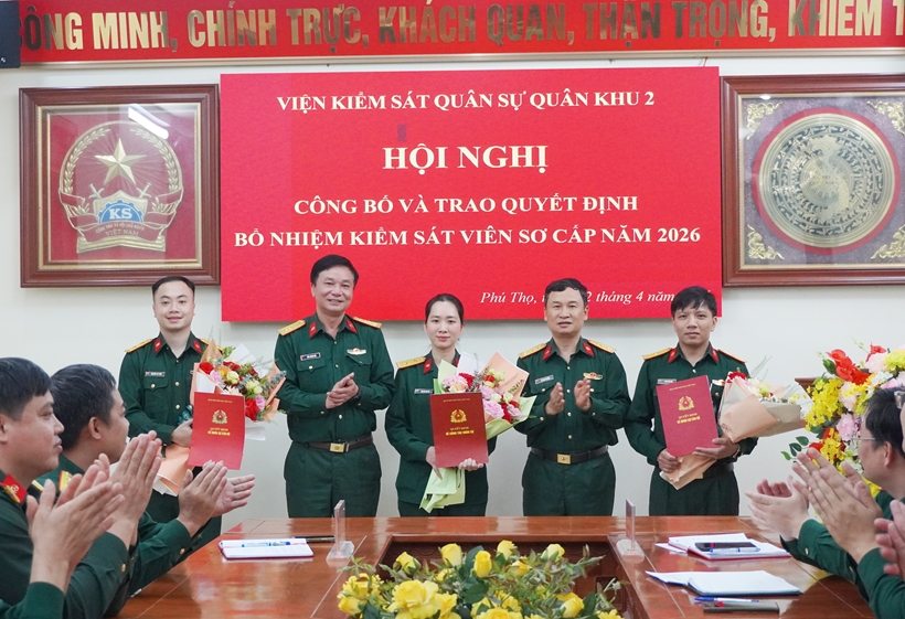 Ngày 2/4/2026 tại trụ sở cơ quan, VKSQS Quân khu 2 tổ chức Hội nghị công bố và trao quyết định bổ nhiệm chức danh kiểm sát viên sơ cấp cho 4 đồng chí trúng tuyển kỳ thi kiểm sát viên năm 2025.