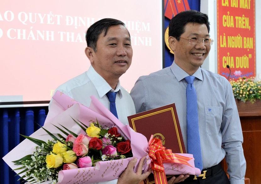 | Chủ tịch UBND tỉnh Bình Định Nguyễn Phi Long trao các quyết định và tặng hoa chúc mừng các cán bộ được bổ nhiệm. |