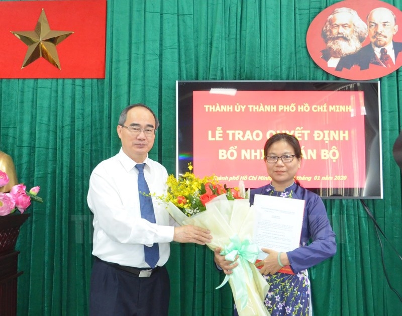 | Bí thư Thành ủy TP HCM Nguyễn Thiện Nhân trao quyết định cho bà Lê Thị Thanh Thúy. (Ảnh: ThanhuyTPHCM) |