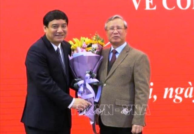 | Đồng chí Trần Quốc Vượng chúc mừng đồng chí Nguyễn Đắc Vinh. Ảnh TTXVN |