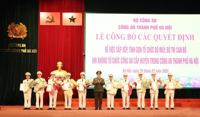 Tại hội nghị, Công an TP Hà Nội đã công bố quyết định của Bộ trưởng Bộ Công an về việc giải thể Công an cấp huyện, quận, thị xã cùng các tổ chức trực thuộc (trừ Đồn Công an). Đồng thời, công bố và trao quyết định về công tác cán bộ, triển khai mô hình tổ chức mới theo kế hoạch từ ngày 01/3/2025.