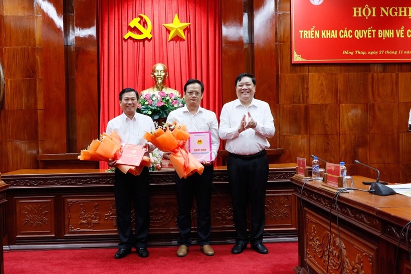 Chủ tịch UBND tỉnh Đồng Tháp Phạm Thành Ngại (bên phải) trao Quyết định và hoa chúc mừng cho ông Trần Ngô Minh Tuấn (giữa) và ông Phạm Văn An.