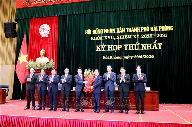 | Lãnh đạo thành phố Hải Phòng tặng hoa chúc mừng Chủ tịch, các Phó Chủ tịch và Trưởng các ban của HĐND thành phố Hải Phòng nhiệm kỳ 2026 - 2031. Ảnh: Mạnh Tú/TTXVN |