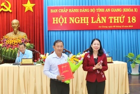 | Ủy viên Trung ương Đảng, Bí thư Tỉnh ủy An Giang Võ Thị Ánh Xuân trao quyết định và chúc mừng đồng chí Nguyễn Tiếc Hùng. |