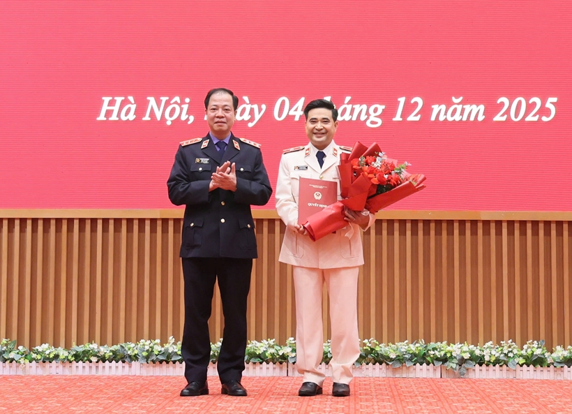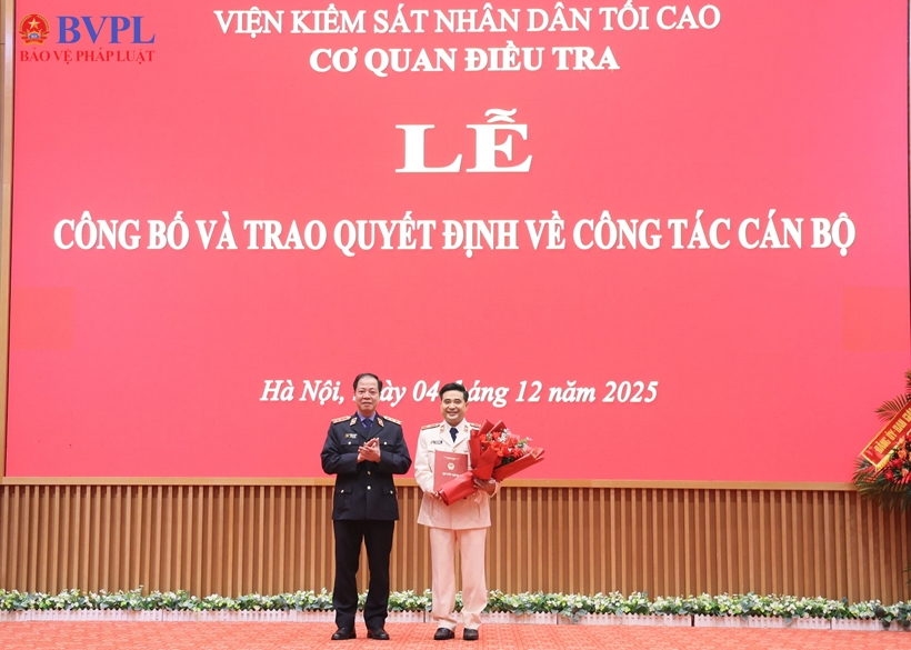 | Đồng chí Trần Hải Quân, Phó Viện trưởng VKSND tối cao trao quyết định và chúc mừng tân Phó Thủ trưởng Cơ quan điều tra VKSND tối cao Lê Đức Hùng. |