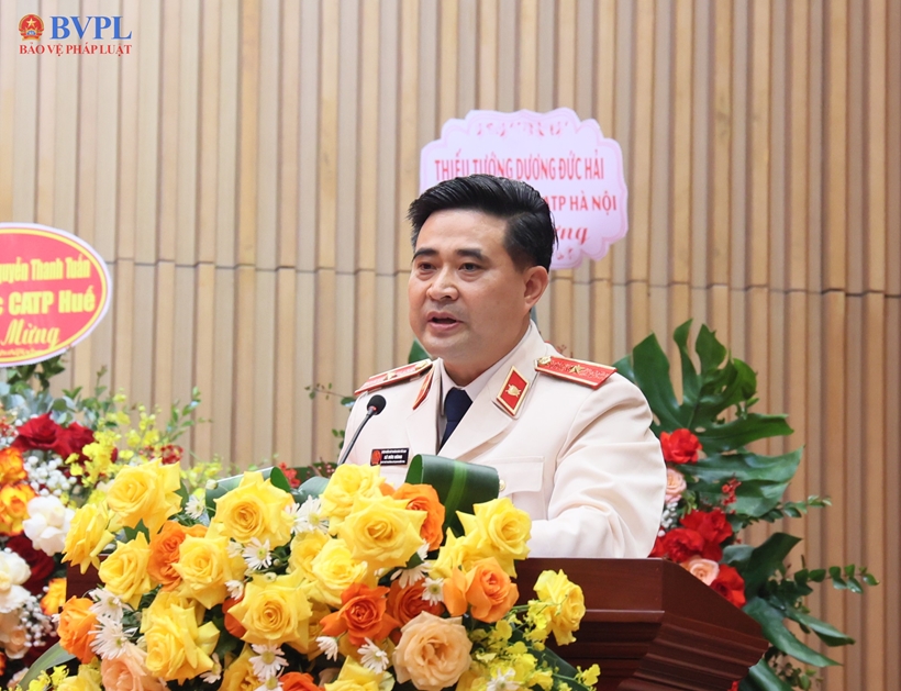 | Lãnh đạo Công an thành phố Hà Nội chúc mừng đồng chí Lê Đức Hùng. |