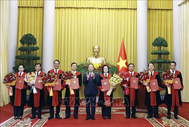 | Tổng Bí thư, Chủ tịch nước Tô Lâm trao Quyết định bổ nhiệm chức danh Thẩm phán Toà án nhân dân Tối cao cho các thẩm phán. Ảnh: Thống Nhất/TTXVN |