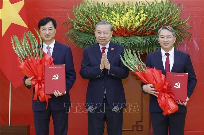 | Tổng Bí thư, Chủ tịch nước Tô Lâm trao Quyết định của Bộ Chính trị và tặng hoa chúc mừng Trưởng ban Tổ chức Trung ương Nguyễn Duy Ngọc và Chánh Văn phòng Trung ương Đảng Nguyễn Hải Ninh. Ảnh: Thống Nhất/TTXVN |