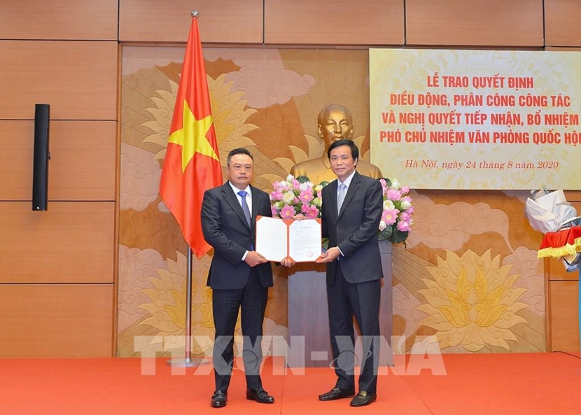 | Tổng Thư ký Quốc hội, Chủ nhiệm Văn phòng Quốc hội Nguyễn Hạnh Phúc (bên phải) trao Quyết định của Bộ Chính trị, Nghị quyết của Ủy ban Thường vụ Quốc hội cho ông Trần Sỹ Thanh. Ảnh: TTXVN |