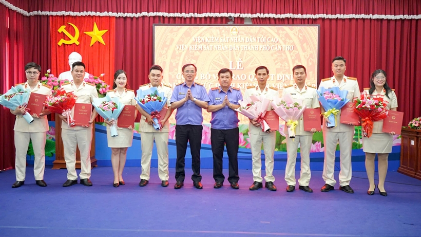 | Lãnh đạo VKSND thành phố Cần Thơ trao Quyết định và tặng hoa chúc mừng các đồng chí tân Kiểm sát viên sơ cấp |