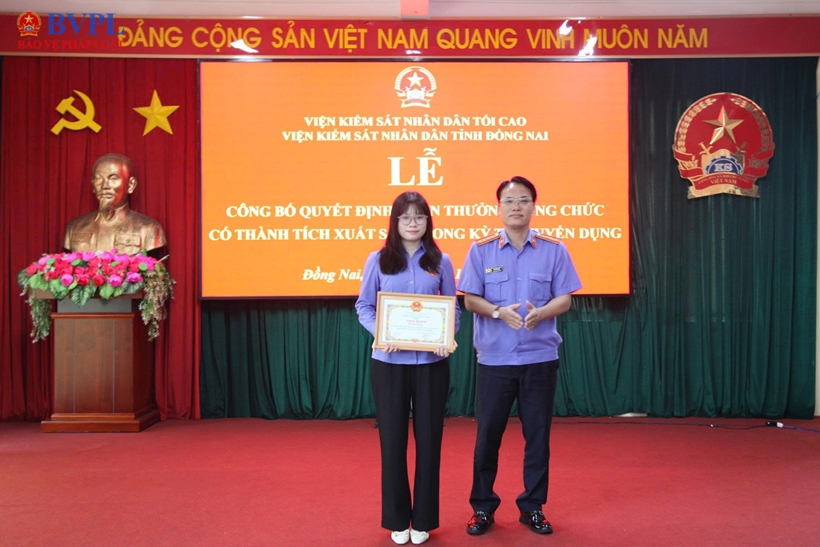 | Đồng chí Ngô Văn Đạt – Phó viện trưởng VKSND tỉnh Đồng Nai tặng Bằng khen cho đồng chí Bùi Phương Nga. |