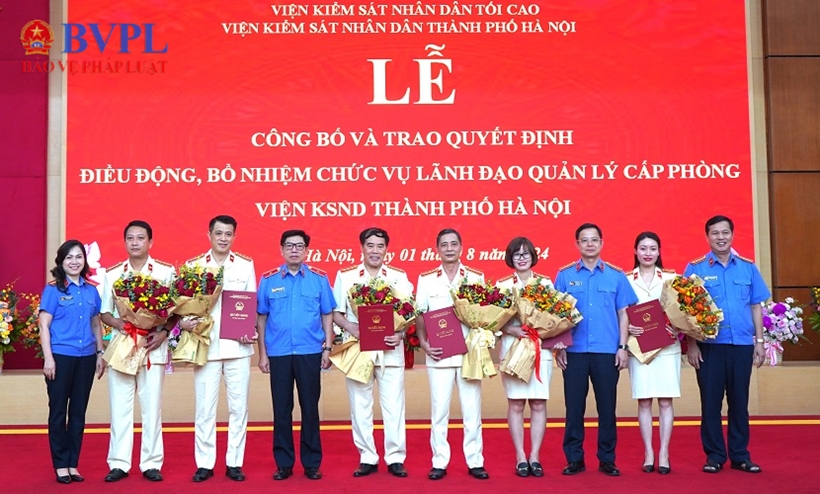 | Lãnh đạo VKSND TP Hà Nội trao quyết định và tặng hoa chúc mừng các đồng chí được điều động, bổ nhiệm. |