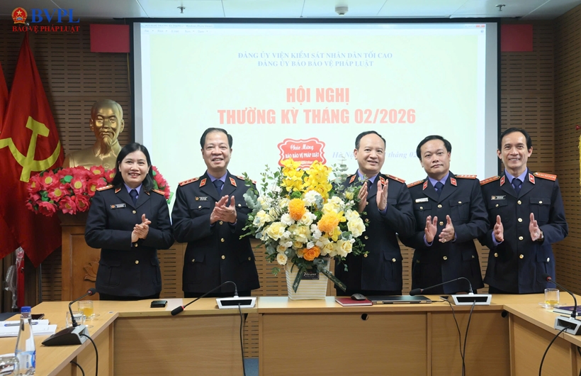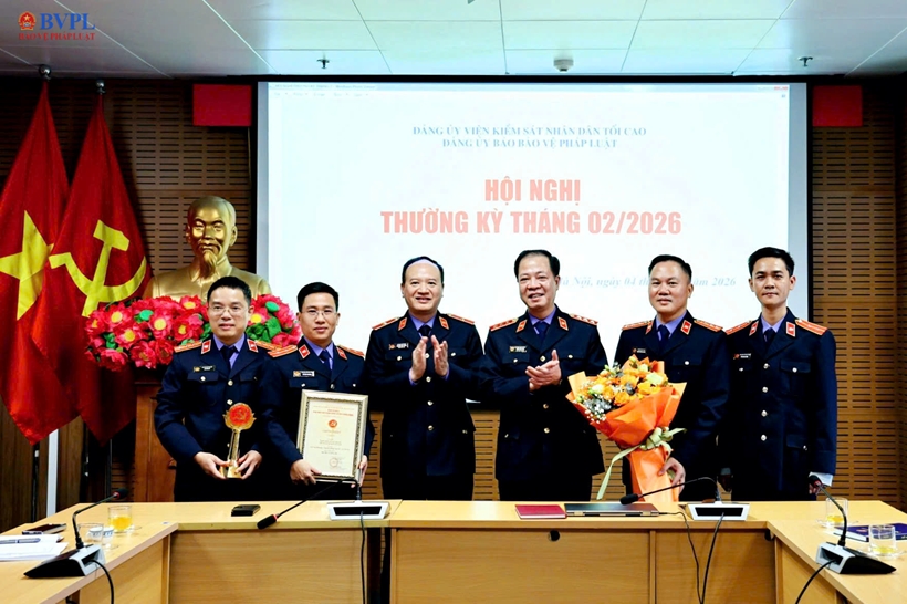 | Đồng chí Trần Hải Quân, Phó Viện trưởng VKSND tối cao, Trưởng Ban Chỉ đạo công tác tuyên truyền ngành Kiểm sát nhân dân tặng hoa chúc mừng Lãnh đạo và nhóm tác giả Báo Bảo vệ pháp luật đạt Giải B Giải Búa liềm Vàng lần thứ X năm 2025. Ảnh: Văn Tình |