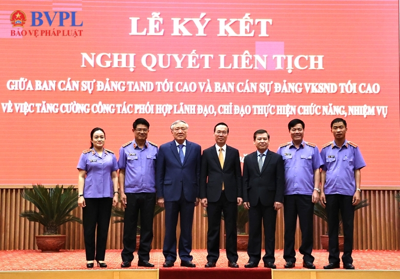 | Chủ tịch nước Võ Văn Thưởng và các đại biểu chứng kiến Lễ ký Nghị quyết liên tịch giữa Ban cán sự đảng TAND tối cao và Ban cán sự đảng VKSND tối cao. |