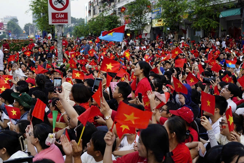 | Khối cờ Đảng, cờ Tổ quốc đi qua, hai bên người dân hò reo. |
