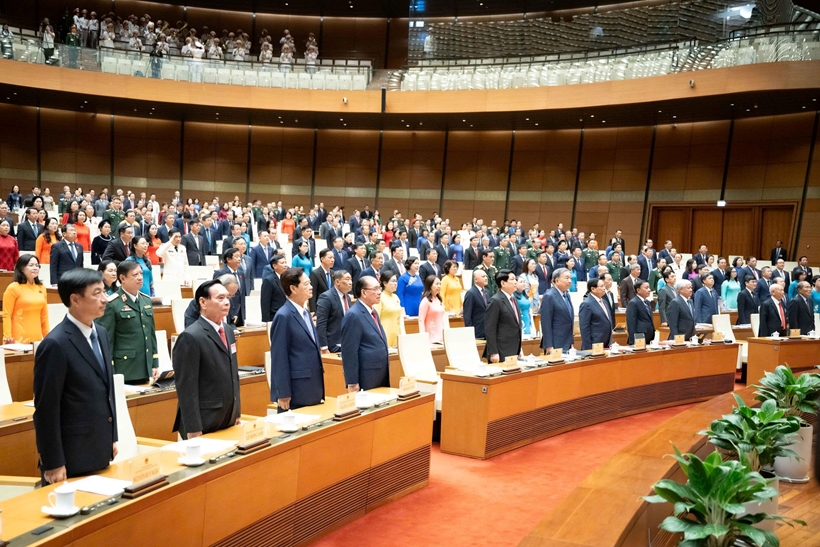 Tổng Bí thư Tô Lâm, Chủ tịch nước Lương Cường, Thủ tướng Chính phủ Phạm Minh Chính, Thường trực Ban Bí thư Trần Cẩm Tú cùng các đồng chí lãnh đạo, nguyên lãnh đạo Đảng, Nhà nước, Mặt trận Tổ quốc Việt Nam, các đại biểu Quốc hội khóa XV thực hiện nghi thức chào cờ. Ảnh: VPQH cung cấp. |