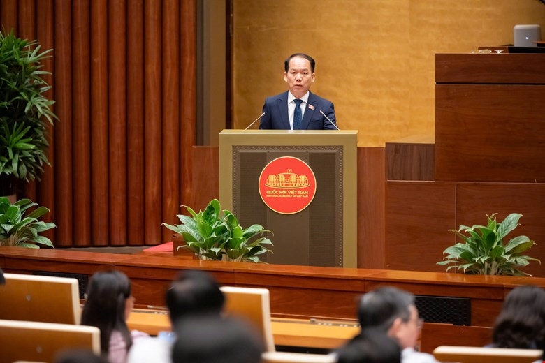| Bộ trưởng Bộ Tư pháp Hoàng Thanh Tùng trình bày tờ trình (Ảnh: Media Quốc hội). |