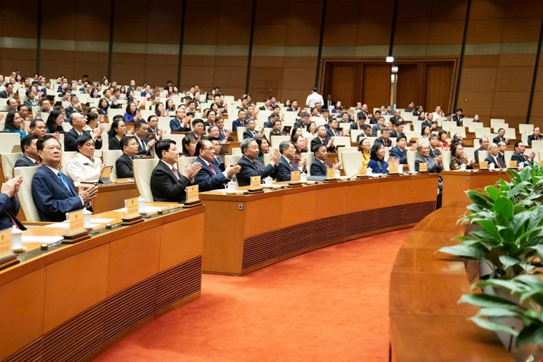 | Tổng Bí thư, Chủ tịch nước Tô Lâm; Thủ tướng Chính phủ Lê Minh Hưng; Thường trực Ban Bí thư Trần Cẩm Tú; các đồng chí lãnh đạo, nguyên lãnh đạo Đảng, Nhà nước, Mặt trận Tổ quốc Việt Nam cùng đông đảo các vị đại biểu Quốc hội khóa XVI dự phiên bế mạc Kỳ họp. (Ảnh: Media Quốc hội) |