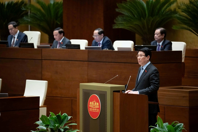 Chủ tịch nước Lương Cường trình bày báo cáo trước Quốc hội. Ảnh: VPQH cung cấp. |