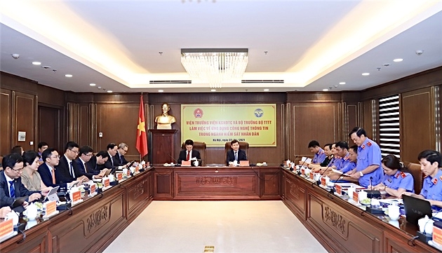 | Toàn cảnh buổi làm việc giữa VKSND tối cao và Bộ Thông tin và Truyền thông về ứng dụng công nghệ thông tin trong ngành Kiểm sát nhân dân ngày 22/4/2021. |