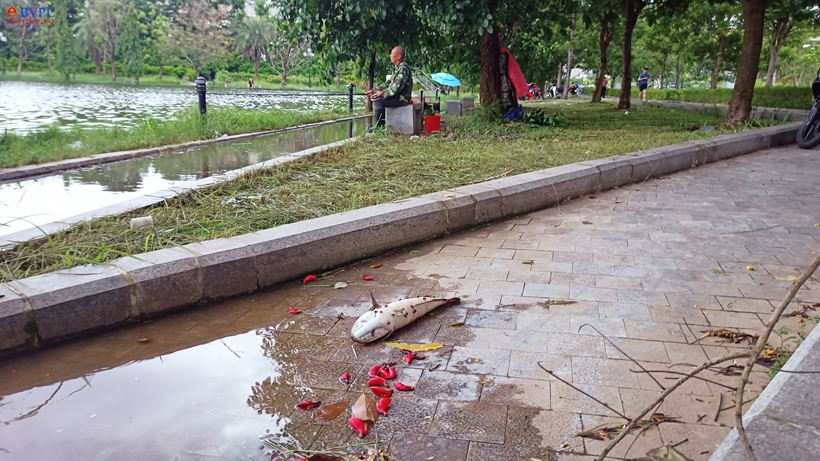 | Cá chết nổi lềnh bềnh trên mặt nước và trên cạn, cộng với rác thải khiến nhiều khu vực trong công viên nồng nặc mùi hôi thối. |