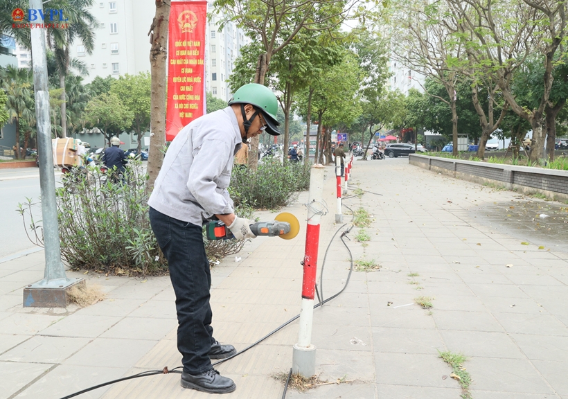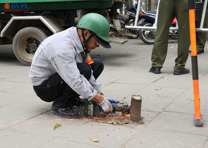 | Dùng máy cắt cột sắt chôn trên vỉa hè như bẫy người đi bộ. |