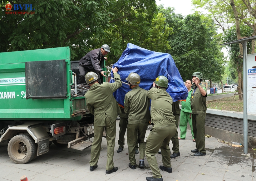 | Lực lượng chức năng Phường Cầu Giấy di chuyển, bốc dỡ xe đẩy hàng chiếm dụng vỉa hè của người đi bộ, gây mất mỹ quan đô thị. |