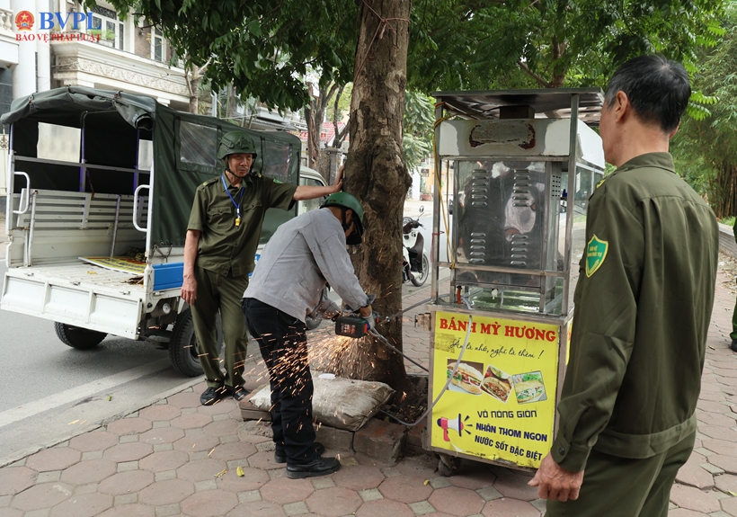 | Một xe hàng rong trên vỉa hè khóa vào gốc cây được lực lượng chức năng cắt khóa, di chuyển. |
