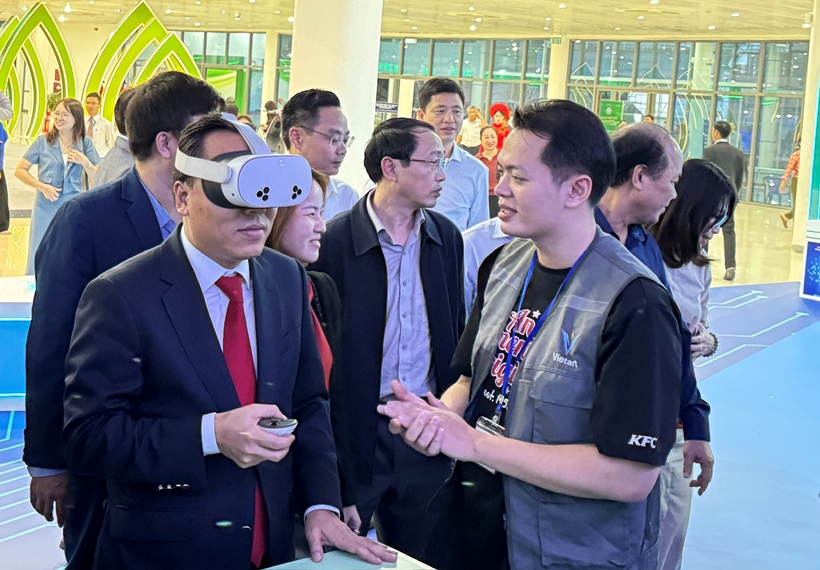 | Thứ trưởng Nguyễn Hoàng Long cùng các đại biểu tham quan tại gian hàng chuyển đổi số, công nghệ thực tế ảo tại hội chợ. |