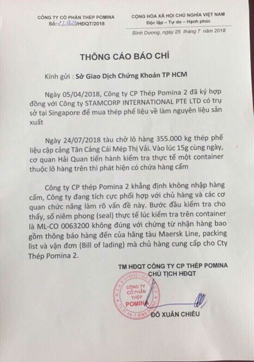 Bản thông cáo nêu, ngày 05/4/2018 công ty cổ phần phép Pomina 2 đã ký hợp đồng với công ty Stamcorp international Pte Ltd có trụ sở tại Singapore để thu mua thép phế liệu về làm nguyên liệu sản xuất. Ngày 24/7/2018 tàu chở lô hàng 355.000 kg thép phế liệu cập cảng Tân Cảng Cái Mép Thị Vải. Vào lúc 15 giờ cùng ngày, Cơ quan Hải quan tiến hành kiểm tra thực tế một container thuộc lô hàng trên thì phát hiện có chứa hàng cấm. Công ty cổ phần phép Pomina 2 khẳng định không nhập hàng cấm, công ty đang tích cực phối hợp với chủ hàng và các cơ quan chức năng làm rõ vấn đề này. Bước đầu kiểm tra cho thấy, số niêm phong (seal) thực tế lúc kiểm tra trên container là MN-CO 006200 không đúng với chứng từ giao nhận hàng bao gồm thông báo hàng đến của hãng tàu Maersk Line, packing list và vận đơn (Bill of lading) mà chủ hàng cung cấp cho công ty cổ phần thép Pomina 2.