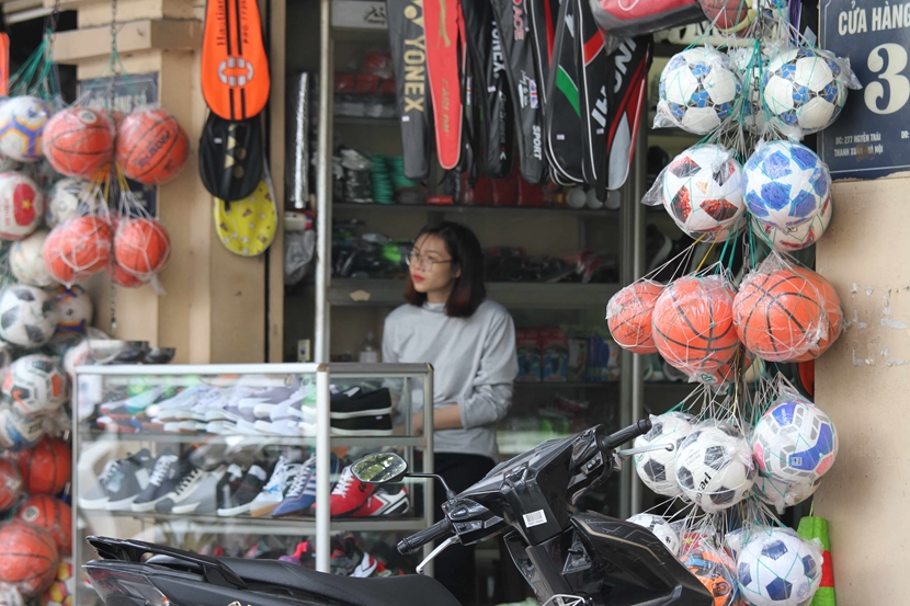 | Một tiểu thương bán giày dép trên phố Nguyễn Trãi. |