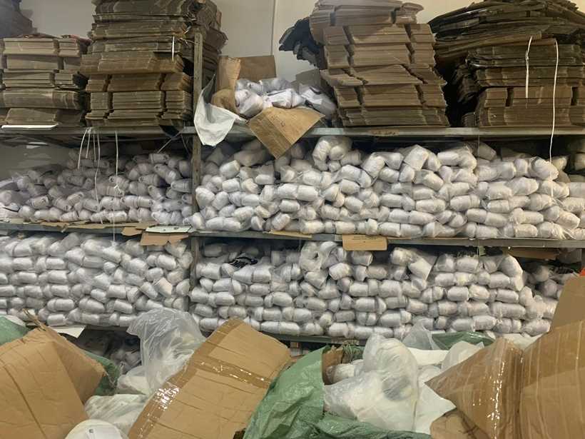 | Kho chứa hàng với hàng nghìn đôi giày thể thao giả mạo các nhãn hiệu nổi tiếng. |