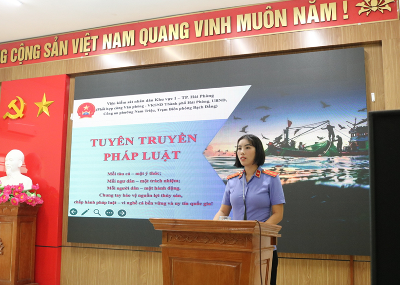 Hưởng ứng “Tháng cao điểm phòng, chống khai thác hải sản bất hợp pháp” theo tinh thần Công điện số 198/CĐ-TTg ngày 17/10/2025 của Thủ tướng Chính phủ, đồng thời thiết thực chào mừng “Ngày Pháp luật nước Cộng hòa xã hội chủ nghĩa Việt Nam năm 2025”, đầu tháng 11/2025, VKSND Khu vực 1 - Hải Phòng chủ trì, phối hợp Văn phòng VKSND TP Hải Phòng, UBND và Công an phường Nam Triệu, Trạm Biên phòng Bạch Đằng tổ chức buổi tuyên truyền pháp luật về phòng, chống khai thác, mua bán, vận chuyển trái phép thủy sản tại Hội trường Công an phường Nam Triệu.