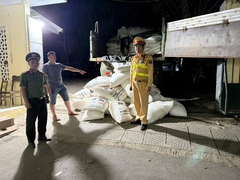 Kiểm tra thùng xe, lực lượng chức năng phát hiện phương tiện đang vận chuyển 200 bao tải màu trắng, bên trong chứa các hạt nhỏ màu trắng, bên ngoài bao bì có chữ Trung Quốc (nghi là phân đạm), mỗi bao nặng khoảng 50kg, tổng trọng lượng khoảng 10 tấn.