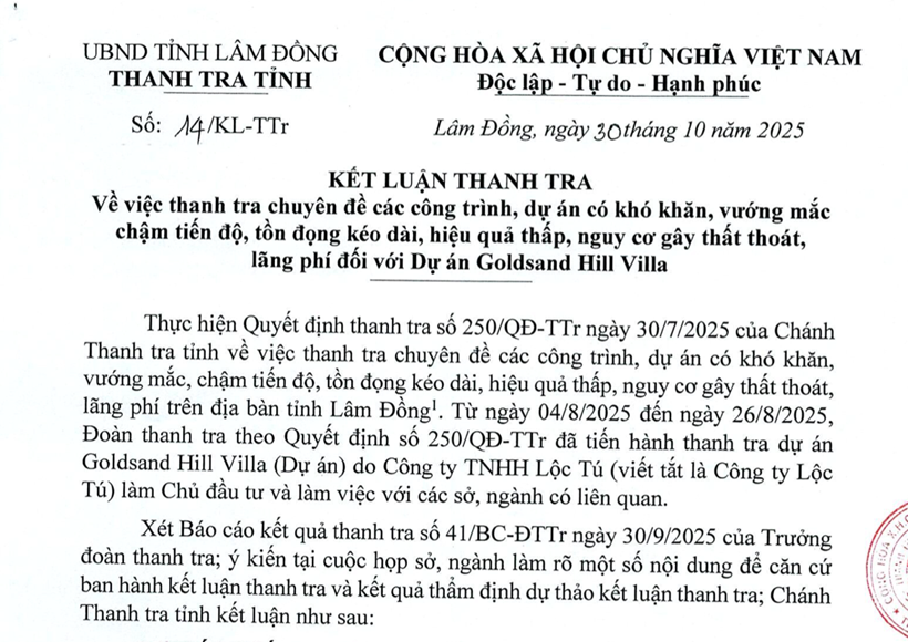Thanh tra tỉnh Lâm Đồng đã ban hành kết luận thanh tra số 14/KL-TTr, đối với dự án Goldsand Hill Villa. Theo hồ sơ, dự án Goldsand Hill Villa tại phường Mũi Né do Công ty TNHH Lộc Tú làm chủ đầu tư có diện tích 89.666m², tổng vốn đầu tư đăng ký 140 tỉ đồng.