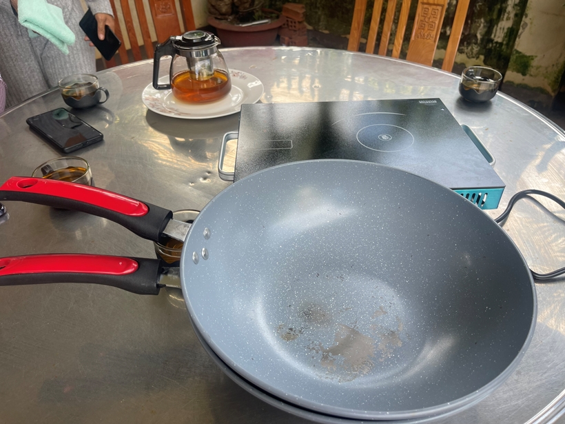 | Chảo chống dính người dân mua về mới nấu một lần đã bị bong tróc, chất lượng kém. |